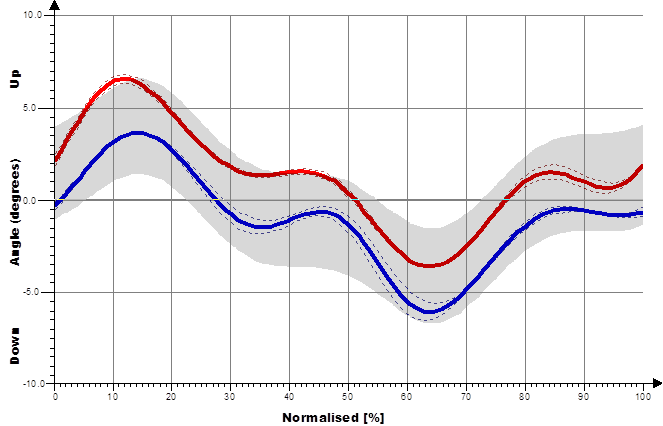 Das Hüftgelenk kommt im Wesentlichen einem idealen Kugelgelenk gleich. Die Belastung entspricht dem Mehrfachen des Körpergewichts, scheint sich aber für das Standbein im Gehen nicht merklich von der Belastung im Einbeinstand zu unterscheiden (Kummer 2005). Es setzen sowohl ein- als auch zweigelenkige Muskeln an, deren Funktion sich je nach Gelenkstellung deutlich ändern kann. Während des Gangzyklus erfolgen Bewegungen in Extension / Flexion (Abbildung 6), Abduktion / Adduktion (Abbildung 7) und Rotationsbewegungen (Abbildung 8). In der Initialphase werden die Extensoren isometrisch (haltend) aktiv um ein Einklappen des Stamms zu verhindern (Engl. Jackknifing= „Taschenmessern“). Im weiteren Verlauf kommt es durch eine zunehmend konzentrische (verkürzende) Kontraktion der Extensoren zu einer Bewegungsumkehr, während der mittleren Standphase erfolgt so die Hüftextension. Dieser Richtungswechsel erfolgt mit Bodenkontakt der Gegenseite in der Vorschwungphase. Zum Ende der Standphase kommt es zu einer Hyperextension, die Hüftextensoren arbeiten nun isometrisch (haltend) und die Flexoren exzentrisch (bremsend). Die Flexion zu Beginn der Schwungphase erfolgt durch eine konzentrische Aktivität der Flexoren. Zum Ende der Schwungphase kommt es dann zu einer exzentrischen Aktivierung der Extensoren.
