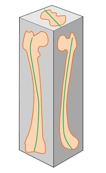 Anatomisch finden sich viele Hinweise auf die genannte Verschraubungsrichtung. Der Femur ist der größte spiralig gedrehte Röhrenknochen im Körper, die Verschraubung ist dabei dreidimensional: C-Bogen in der Sagitalebene, S-Bogen in der Frontalebene (Neigung der Schenkelhalsachse gegen die transversale Kondylenachse) und Rotation in der Horizontalebene (Antetorsion). (Abb. 1) Auch die Tibia ist verschraubt, C-Bogen in der Sagitalebene, S-Bogen in der Frontalebene (vom lateralen Tibeaplateau zum Malleolus medialis) und Rotation in der Horizontalebene (Tibiatorsion) (Abb. 2). Die Aufgabe des Beinskeletts besteht darin, die Belastung von oben nach unten und umgekehrt zu leiten. Dies wird durch den spiraligen Verlauf der belastungsstabilen Knochenachse gewährleistet.