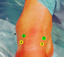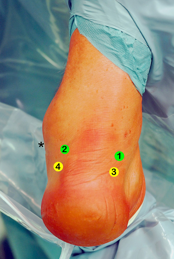 Die hohen paraachillären Zugänge befinden sich auf Höhe der Außenknöchelspitze (*) unmittelbar medial und lateral der Achillessehne. Um den N. suralis nicht zu verletzen, wird die Haut nur vorsichtig inzidiert und die Weichteile werden mit einem Klemmchen aufgespreizt.