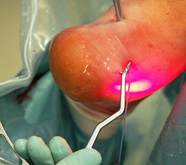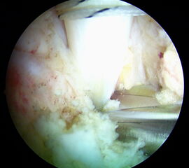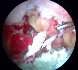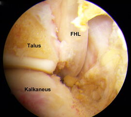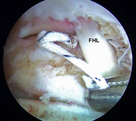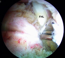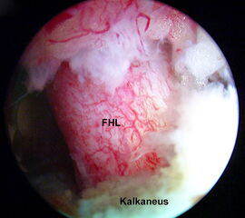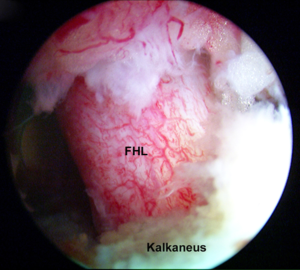 - Verletzung des posterioren tibialen Gefäßnervenbündels: durch die Ausrichtung der der Arbeitsöffnung der Instrumente (Shaver, Radiofrequenzsonde) nach lateral können die neurovaskulären Strukturen mit der geschlossenen Seite des Arbeitsgeräts geschützt werden. Das Risiko von Verletzungen wird deutlich vermindert, wenn medial der FHL-Sehne mit äußerster Vorsicht präpariert wird.