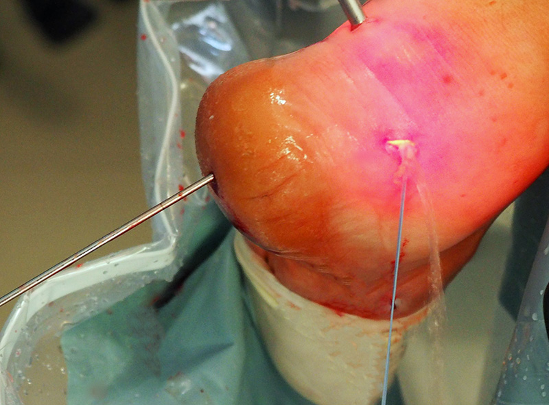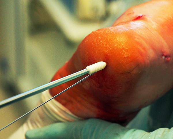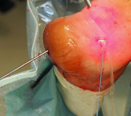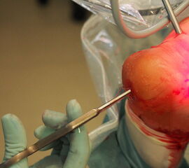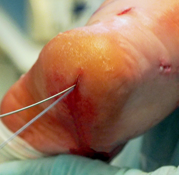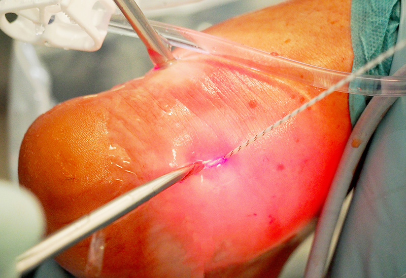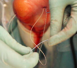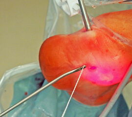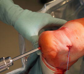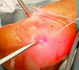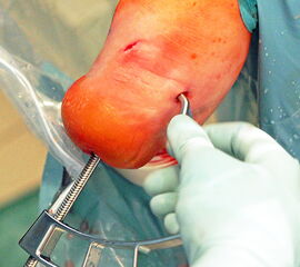 - Wundheilungsstörungen/Fistelbildung: das Risiko einer Wundheilungsstörung oder einer Fistelbildung kann durch einen sorgfältigen Wundverschluss deutlich reduziert werden. Die Portale sollten anstelle von Klammerpflastern o. ä. durch Einzelknopf- oder Einzelknopfrückstichnähte verschlossen werden. Bewährt haben sich 2 Nähte pro Portal, um die Haut sicher zu verschließen.