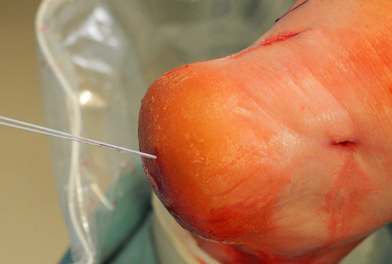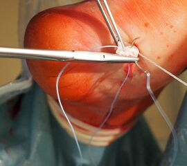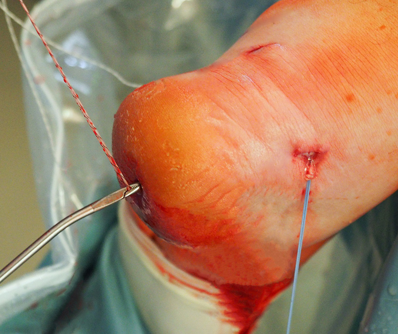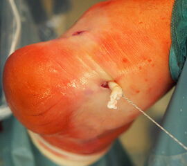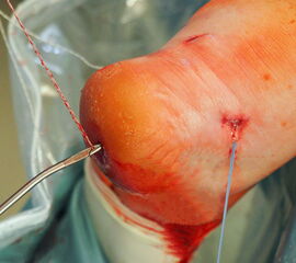 - Fakultativ: Blutsperre. Wird eine Blutsperre verwendet, sollte diese am Oberschenkel angelegt werden. Die Anlage am Unterschenkel führt zu einer Kompression des M. flexor hallucis longus was die Einschätzung der Sehnenspannung bei der Fixation erschwert, bzw. unmöglich machen kann.