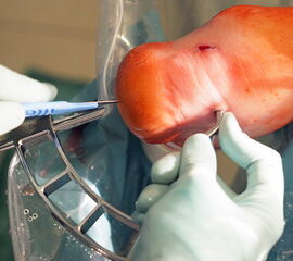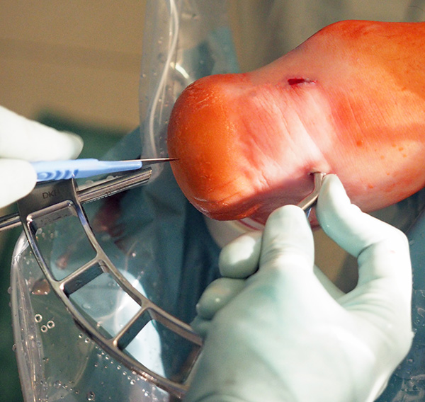 Nachfolgend wird die OP-Technik an einem linken Fuß unter Verwendung einer PEEK-Schraube veranschaulicht.