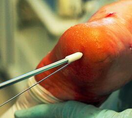 - Feine Schere, 11er Skalpell oder Punch zur Tenotomie der FHL-Sehne.