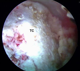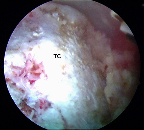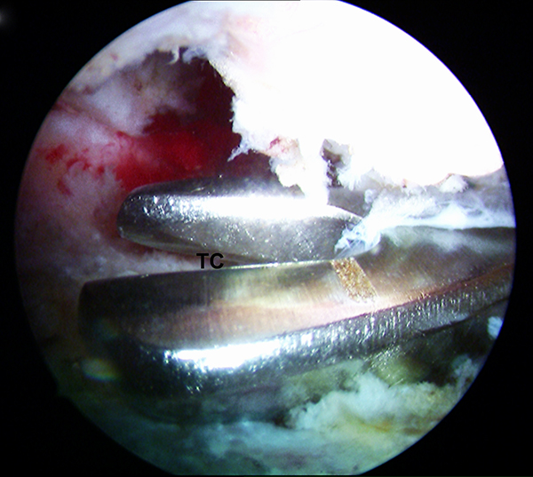 Im nächsten Schritt erfolgt die arthroskopische Darstellung des Tuber calcanei (TC) mit Hilfe des Weichteilshavers und der Radiofrequenzsonde, bis eine gute Übersicht über die knöchernen Strukturen gegeben ist. Damit eine einwandfreie Orientierung und Platzierung des Zielgeräts gewährleistet ist, müssen alle störenden Gewebereste vollständig am Tuber entfernt werden. Zur besseren Übersicht kann es ggf. erforderlich sein, zusätzlich die tiefen paraachillären Zugänge zu verwenden (siehe oben). Unter arthroskopischer Sicht wird der Zielbügel über das posteromediale Portal eingeführt und auf der kranialen Prominenz des Tuber calcanei (TC) platziert. Arastru et al. 15 konnten in biomechanischen Untersuchungen am Kadaver nachweisen, dass die Fixation der FHL-Sehne möglichst weit posterior am Kalkaneus zu einem günstigen Hebelarm mit der besten Kraftentwicklung in der Plantarflexion führt.