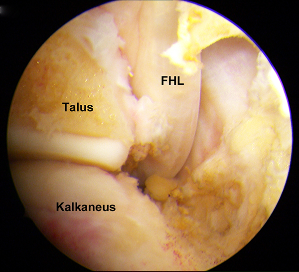 Einführen des 4,0 mm Arthroskops über den posterolateralen Zugang und des Shavers über das posteromediale Portal. Es wird zunächst ein Weichteildebridement im Kagerschen Raum durchgeführt, bis die Flexor hallucis longus-Sehne (FHL) identifiziert werden kann (siehe auch Kapitel „Dorsale Arthroskopie des oberen und unteren Sprunggelenks“, Abbildungen 5-10).