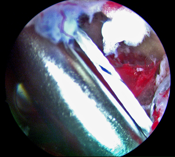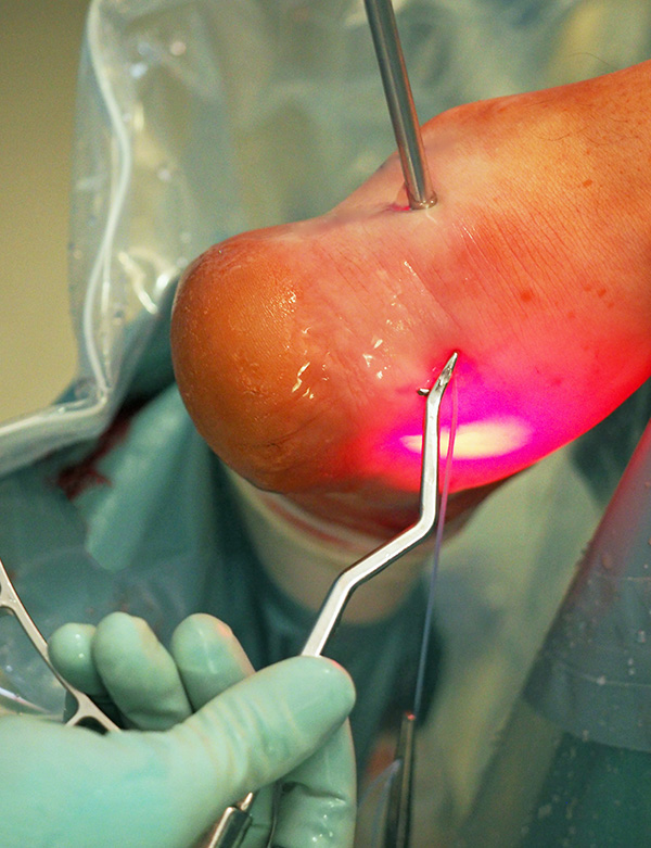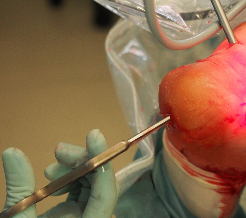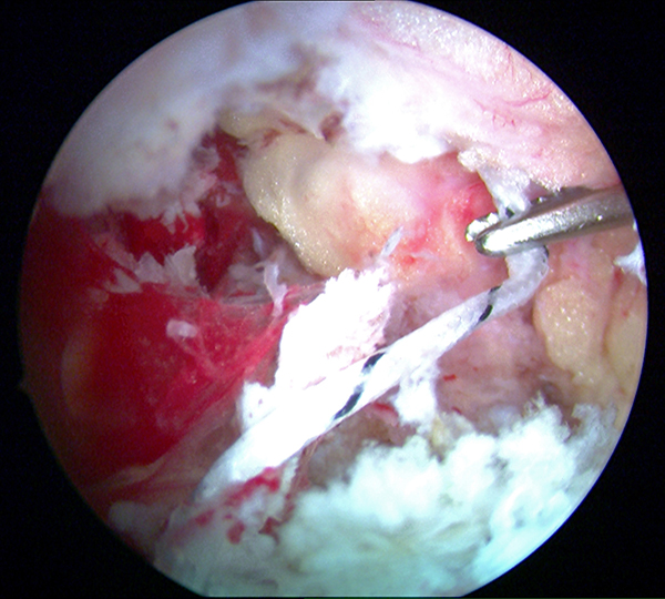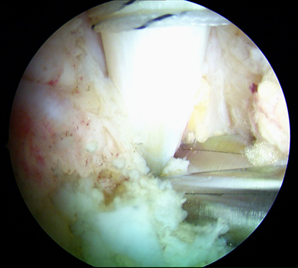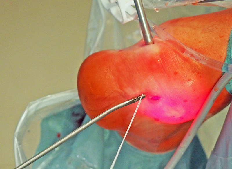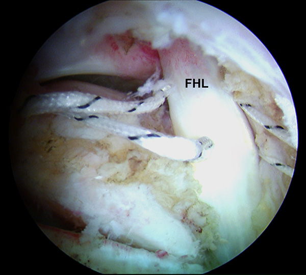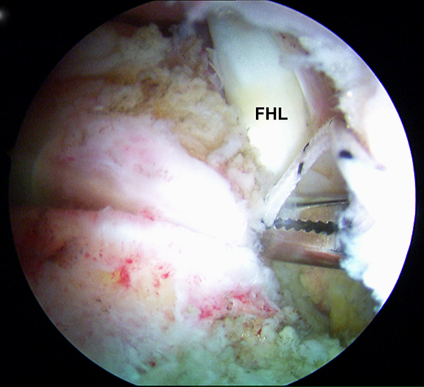 In maximaler Plantarflexion des Fußes wird die FHL-Sehne durch kräftigen Zug an den Fadenenden nach kranial mobilisiert und soweit wie möglich distal tenotomiert. Die Tenotomie kann mit einer feinen Schere, einem Punch oder mit einem 11er Skalpell über den posteromedialen Arthroskopiezugang durchgeführt werden. Für die Tenotomie sollte eine gute Übersicht vorhanden sein, um eine Verletzung des Gefäß-Nerven-Bündels zu vermeiden. Der Sehnenstumpf wird aus dem posteromedialen Portal ausgeleitet.
