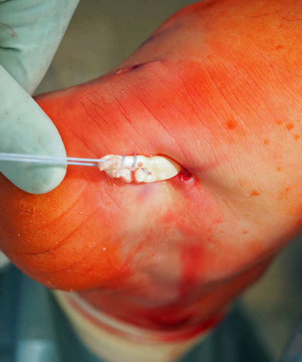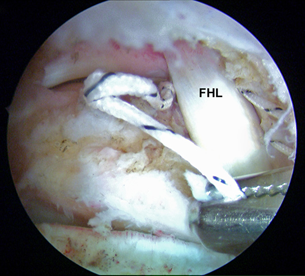 Anschließend wird die FHL-Sehne angeschlungen. Hierzu wird die Fadenschlaufe über das posteromediale Portal mit einer Fadenzange oder einem gebogenen Klemmchen um die FHL-Sehne geführt und anschließend wieder aus dem Portal herausgezogen. Nach Durchfädeln der freien Fadenenden durch die Schlaufe wird die Schlinge festangezogen. Die Technik wird in Video 2 demonstriert.