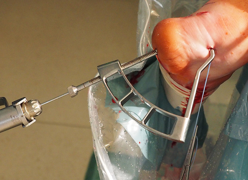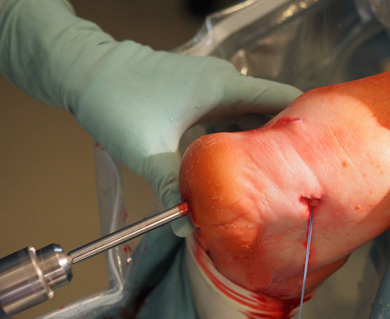 Nach korrekter Platzierung des Zielbügels, wird die Bohrhülse des Zielgeräts über eine kleine Stichinzision plantar zentral an der Ferse bis an den Kalkaneus geschoben. Durch die Hülse wird ein K-Draht bis durch die Gegenkortikalis eingebracht. Als nächstes werden die Hülse und der Zielbügel entfernt und der Draht wird mit einem kanülierten Bohrer bis durch die Gegenkortikalis überbohrt, so dass ein durchgehender Knochentunnel entsteht. Der Durchmesser des Bohrers wird vorher anhand des gemessenen Sehnendurchmessers bestimmt und sollte 0,5mm größer als der Sehnendurchmesser gewählt werden, damit bei der späteren Fixation der Sehne genügend Platz für eine Interferenzschraube bleibt (Beispiel: Sehnendurchmesser 6mm, Bohrer 6,5mm). Die Positionierung des K-Drahts und die Lage des Bohrkanals sollten mit einem Bildverstärker im seitlichen Strahlengang intraoperativ kontrolliert werden.