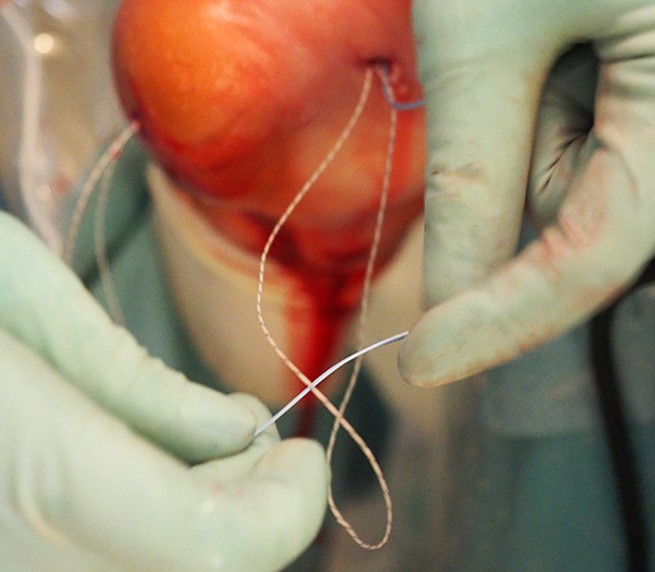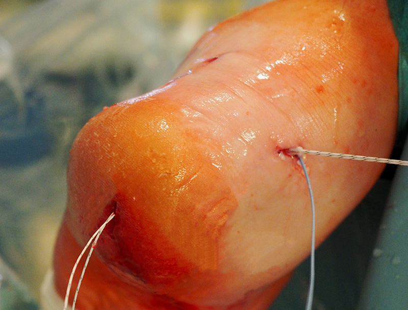 Armierung des Sehnenstumpfes mit einem kräftigen Faden (z.B. USP 2) in Baseballsstitch-Technik und Messen des Sehnendurchmessers.