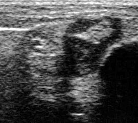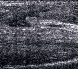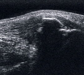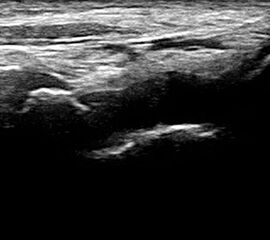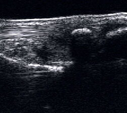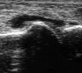 Befunde: Ein echoarmer Ring um die echogene Sehne ist Ausdruck der Flüssigkeitsumscheidung. Bei entzündlicher Ursache auf dem Boden einer rheumatologischen Erkrankung kommt es im zeitlichen Verlauf zum Übergang in eine chronische Tendinopathie. Durch Verklebungen mit dem Sehnengleitgewebe kann das Gleiten der Sehne behindert sein.
