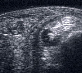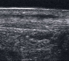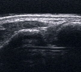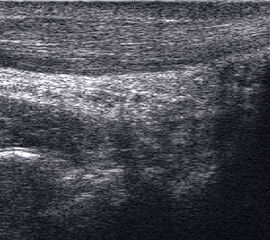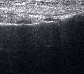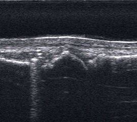 Referenzstrukturen: Knochen sehr oberflächennah als echogene Linie erkennbar. Daher Verwendung einer Vorlaufstrecke sinnvoll.