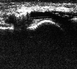 Befunde: Echofreie Vorwölbung der Gelenkkapsel durch Erguss (Abb.7). Verbreiterter synovialer Randsaum, PD ggf. positiv. Bei ausgeprägter proliferativer Synovialitis mitunter fingerartige echogene Binnenstrukturen, bei Kompression Aquariumeffekt oder weitgehende Auffüllung der Gelenkapsel durch Proliferat. Bei aggressiver rheumatoider Arthritis breites echogenes, auf Knochen und Knorpel übergreifendes Pannusgewebe. Alle Anteile der Gelenkkapsel sind zu untersuchen. Daher auch Untersuchung in Bauchlage. Eine bakteriell bedingte Arthritis ist sonographisch nie sicher auszuschließen.