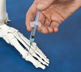Der Gelenkspalt des oberen Sprunggelenks ist zwar klinisch meist gut aufzufinden, eine Kapselschwellung oder Arthrose mit osteophytären Anbauten kann eine intraartikuläre Injektion jedoch deutlich erschweren. Dies gilt noch mehr bei Arthrosen oder Ganglien der Zehengrundgelenke und am Mittel- bzw. Rückfuß. Hier wie auch bei rheumatoider Arthritis kann zunächst sonographisch untersucht werden, wo und in welcher Tiefe die beste Zugangsmöglichkeit besteht.