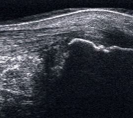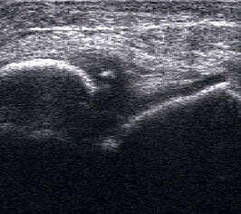 Der hyaline Gelenkknorpel ist nur in wenigen Gelenkabschnitten zugänglich, dort aber, besonders im Wachstum und mit höher auflösenden Schallköpfen gut zu beurteilen. Er stellt sich echoarm und glatt begrenzt dar. Darunter liegt echogen der subchondrale Knochen, darüber das mäßig echogene Gelenkkapselgewebe.