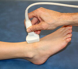 Die Sonographie stellt in der Abklärung von Verletzungen und Erkrankungen an Sprunggelenk und Fuß wie auch an anderen Bewegungsorganen den „verlängerten klinischen Finger“ dar. Das heißt, dass der Untersucher selbständig auffällige klinische Untersuchungsbefunde unmittelbar (bed side) (Abb. 1) strukturell, aber auch funktionell unter Sicht am Monitor (real-time) überprüfen kann 1. Technische Voraussetzung ist hierzu ein Ultraschallgerät mit Tauglichkeitsbescheinigung des Herstellers für Bewegungsorgane.