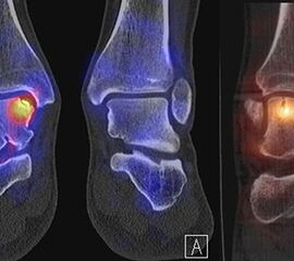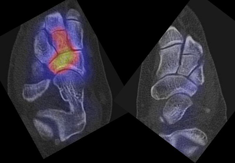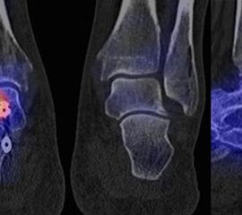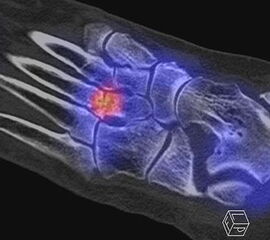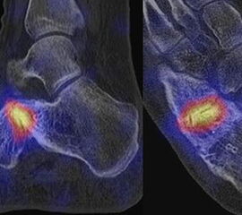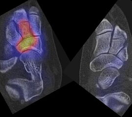 Parthipun et al. untersuchten den Stellenwert der SPECT/CT bei 52 Patienten mit schmerzhaften Fußwurzelarthrosen. Bei 37 % Änderung der geplanten Injektion (0,5 % Bupivacain und 80 mg Methylprednisolon) durch die SPECT/CT-Befunde. Die Erfolgsrate betrug 88 % entsprechend einer Schmerzreduktion von mindestens 50 % gemäß VAS. Die SPECT/CT wurde von den Autoren als hilfreiche Ergänzung zur klinischen Untersuchung eingestuft 13.