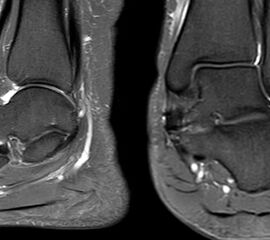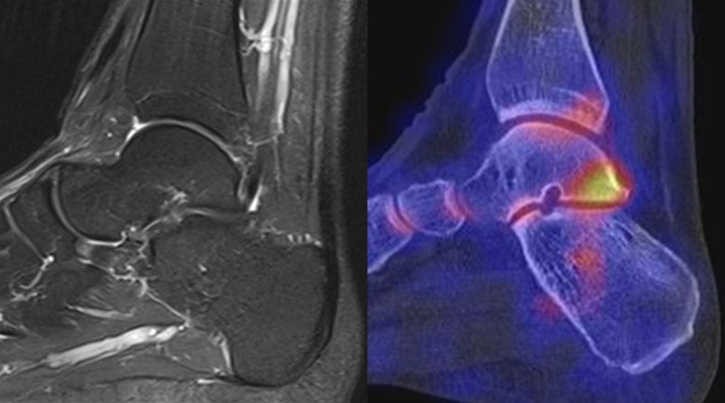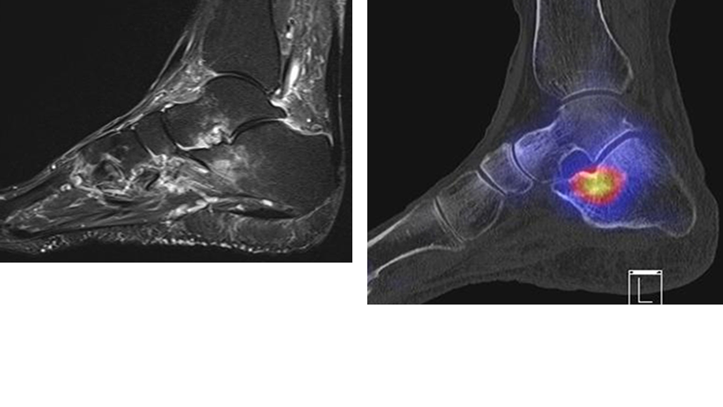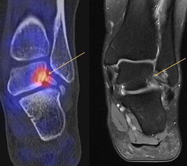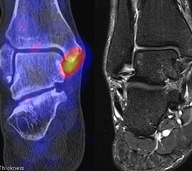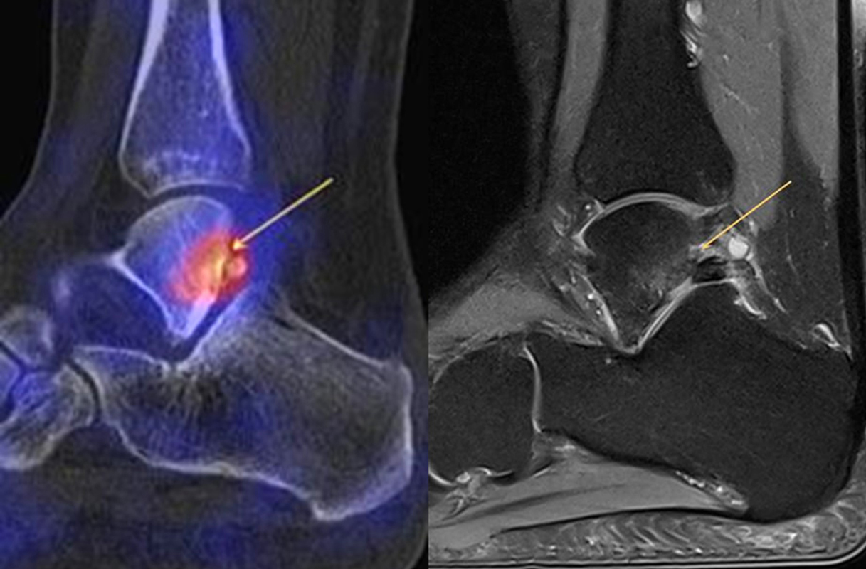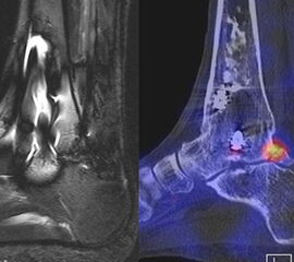 Eine Studie an 37 Patienten verglich direkt den diagnostischen Nutzen der MRT und SPECT/CT bei Knöchel- und Fußschmerzen mit unklarer Schmerzursache. Retrospektiv wurden Daten von Patienten mit Knöchel- oder Fußschmerzen analysiert, die sowohl eine MRT als auch eine SPECT/CT erhalten hatten. Läsionen und wahrscheinliche Schmerz-erzeugende Foci wurden jeweils im MRT- und im SPECT/CT registriert, klinisch korreliert, entsprechend behandelt und nachuntersucht. Bei den Patienten, bei denen eine signifikante Verbesserung auf die Therapie eintrat, wurde angenommen, dass die Diagnose unter Berücksichtigung der Bildgebung richtig gestellt wurde. Das Spektrum umfasste Weichteilläsionen (Bänder/Sehnen), Gelenk-Läsionen (Arthritis, Arthrose) und Knochenläsionen (Frakturen/Osteomyelitis/osteochondrale Läsionen). Insgesamt hatte die MRT eine Sensitivität, Spezifität, positiven Vorhersagewert und negativen Vorhersagewert von 82 %, 31 %, 74 % bzw. 42 %, und die SPECT/CT von 84 %, 60 %, 84 % und 60 % bzw. Der mittlere FADI-Score (Foot and Ankle Disability Index) für alle Patienten lag prätherapeutisch bei 61,5 (SD = 13,8) und posttherapeutisch bei 88,4 (SD = 13,01)(p < 0,05), was darauf hindeutet, dass die endgültige Bildgebungs-unterstützte Diagnose korrekt war. Insgesamt wurde bei 26 % der Patienten eine Therapieänderung aufgrund der höheren Spezifität der SPECT/CT-Befunde gegenüber der alleinigen MRT-Befunde beobachtet. Vor allem bei Knochenläsionen erwies sich die SPECT/CT als vorteilhaft, jedoch nicht bei Weichteilläsionen 72.