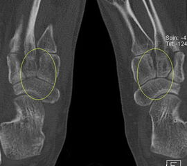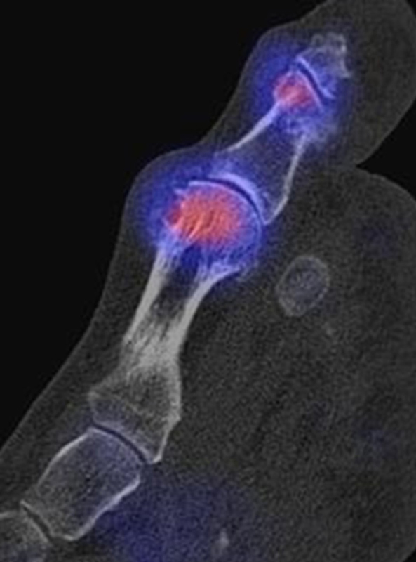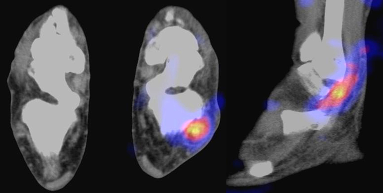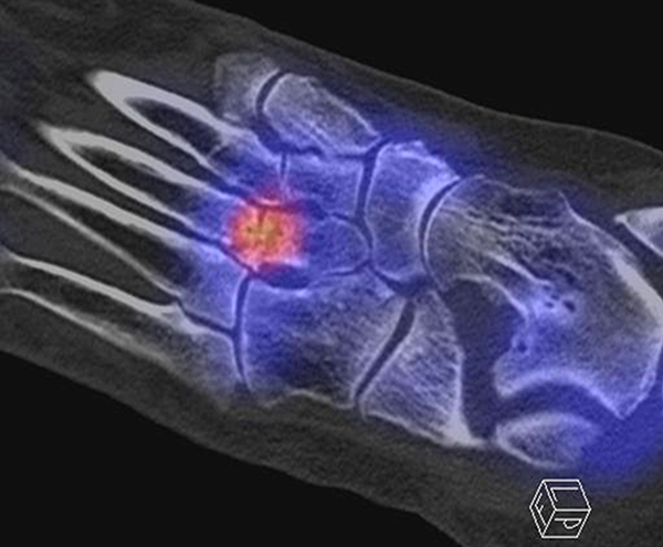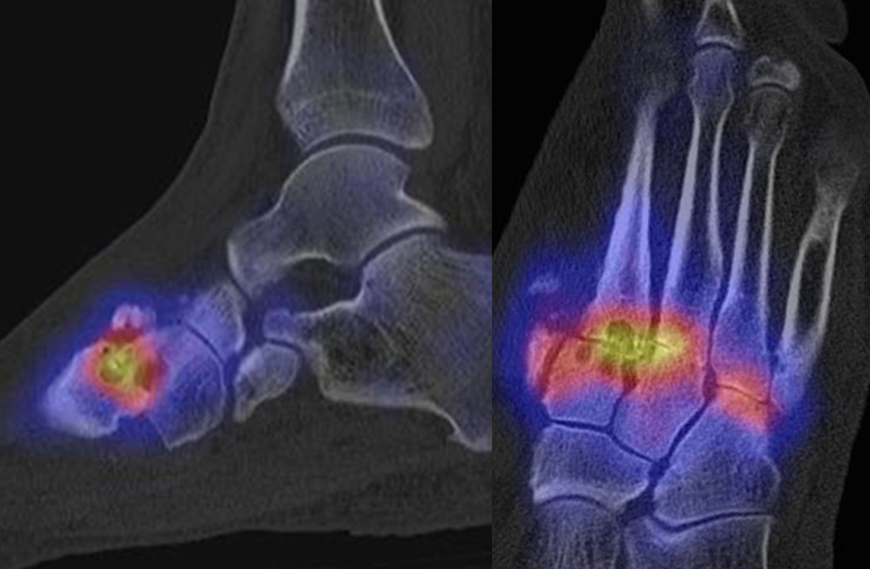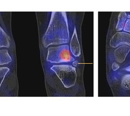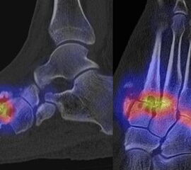 Die enge anatomische Beziehung der Mittel- und Rückfuß-Gelenke bei gehäuft nur subtilen morphologischen Veränderungen, die jedoch Schmerzen verursachen können, kann mit Hilfe der SPECT/CT übersichtlich differenziert werden.