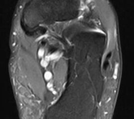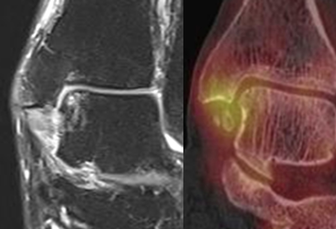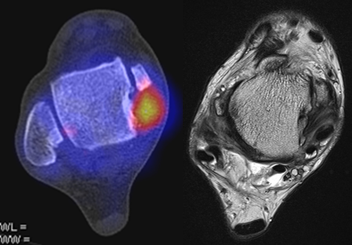 Unbestritten ist die MRT aufgrund ihrer hohen Sensitivität zum Nachweis/Ausschluss von Weichteil- und Sehnenläsionen die primäre diagnostische Methode. Allerdings kann die SPECT/CT die MRT, in dem sie die Schmerz-Relevanz der Sehnen-Läsion bildgebend zuordnen kann, unter Umständen ergänzen 5.