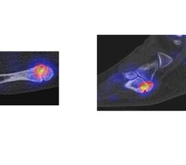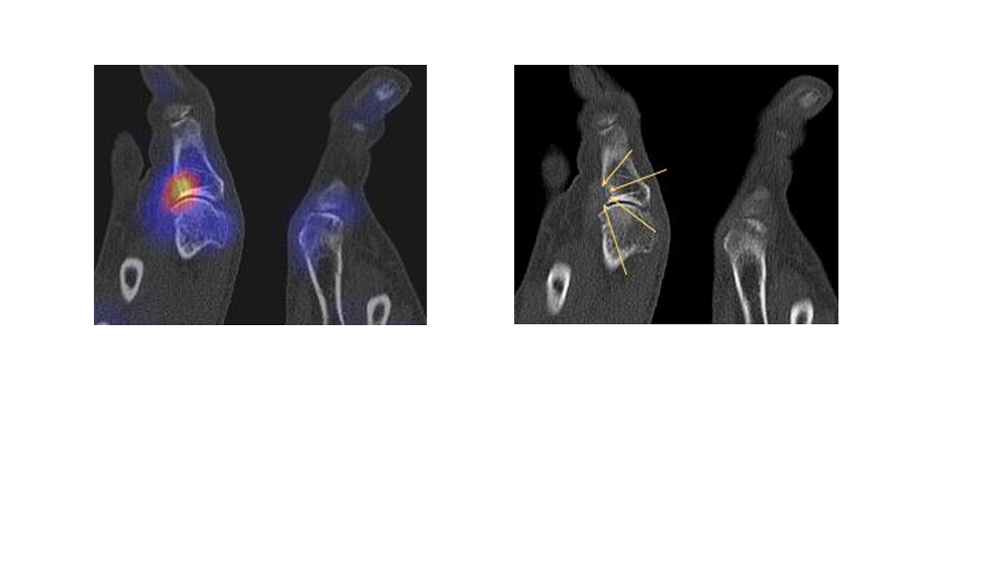 - Fokale oder flächige Mehranreicherungen in angrenzenden Gelenken in Verbindung mit arthrotischen Veränderungen im CT → V. a. symptomatische Arthrose