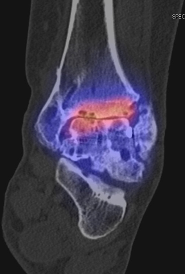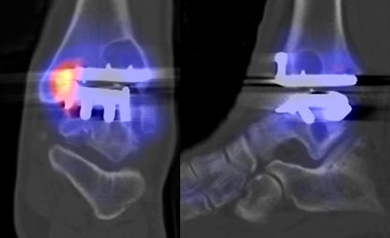 Eine Analyse von Mason et al. 53 von 14 Patienten mit schmerzhaften Sprunggelenksprothesen, welche mittels SPECT/CT untersucht wurden, fanden in 13/14 Patienten ein SPECT/CT-Korrelat für die Beschwerden, wobei bei 12 Patienten der Fokus talar medial lokalisiert war. 8 Patienten wurden operativ revidiert und der Fokus entsprach einer verminderten bzw. fehlenden ossären Integration der talaren Prothesen-Komponente.