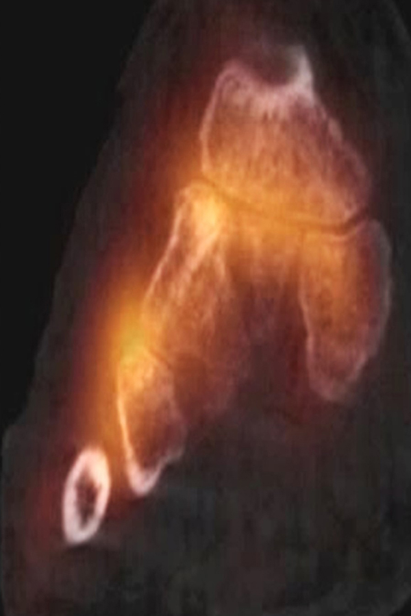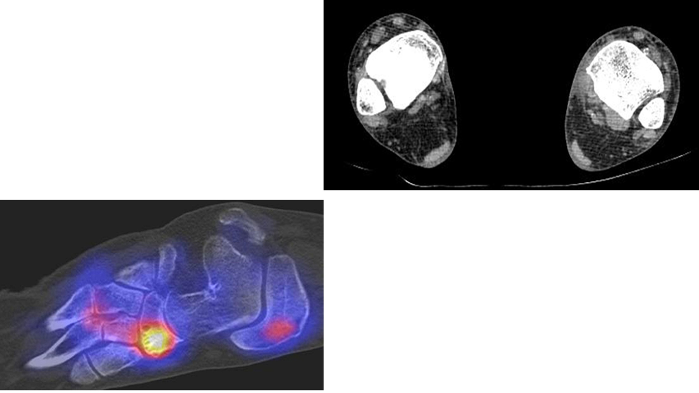 Bei der Diagnostik von Osteomyelitiden stellt die SPECT/CT ein wertvolles Tool dar. Prinzipiell kann durch die Kombination mit einer dünnschichtigen CT neben der Entzündungs-bedingten Knochenstoffwechsel-Steigerung die Röntgen-Pathoanatomie einer Entzündung detailliert dargestellt werden. Ein Beispiel für eine tarso-metatarsale Osteomyelitis in Kombination mit Arthritis liefert die Abbildung 1.5., hier finden sich sowohl typische Röntgenzeichen einer Osteomyelitis wie eine deutliche regionale Osteoporose/Osteopenie der beteiligten Knochen und die Arrosion der subchondralen Grenzlamellen im Rahmen der Arthritis.