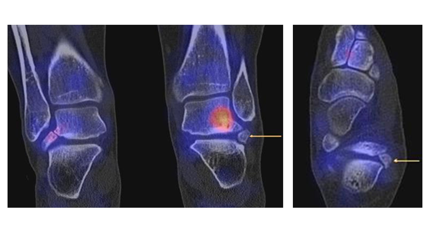 Im Fußskelett finden sich zahlreiche Normvarianten, zu denen auch Varianten der Sesambeine, das Auftreten von akzessorischen Ossikeln und überzählige Knochen gehören. Diese Varianten sind häufig asymptomatisch, können jedoch infolge von Überlastungen über degenerative Veränderungen oder Traumata symptomatisch werden. Je nach Lokalisation können sie auch Impingement-Syndrome verursachen. Unter Umständen müssen Sesambeine bzw. akzessorische Ossikel von Frakturen differenziert werden. Für sämtliche der genannten klinisch relevanten Fragestellungen ist die SPECT/CT die optimale diagnostische Methode. In der Literatur finden sich seit der Verfügbarkeit des SPECT/CT zunehmend Berichte über symptomatische Akzessoria, welche mit Hilfe der SPECT/CT eindeutig als Symptom-verursachend klassifiziert werden können.