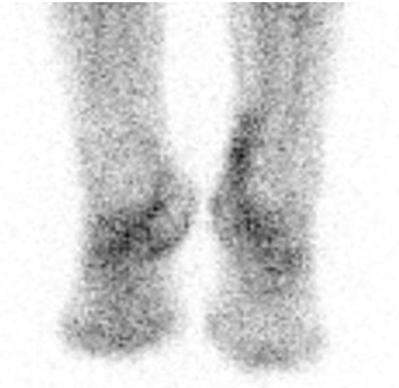 Protheseninfekte nach Sprunggelenkprothesen-Implantation treten relativ selten bzw. in ca. 1 - 2,5 % auf 55. Es existieren mehrere szintigraphische Untersuchungsverfahren bei Verdacht auf einen Prothesen-Infekt, wobei relativ hohe Treffsicherheiten im Nachweis von Infektionen von 90 % erreicht werden können 56. Der Goldstandard sind in vitro markierte Leukozyten in Kombination mit einer ergänzenden Knochenmark-Szintigraphie, wobei dieses Verfahren als sehr aufwändig und kostenintensiv einzustufen ist. Eine praktikablere Alternative sind in vivo mittels Tc99m-Antikörper oder Tc99m-Antikörper-Fragmenten markierte Granulozyten, wobei hier die Anwendung eines dynamischen Messprotokolls mit zwei Messpunkten 4 h und 20 h nach Injektion des Radiopharmakon und der Einsatz des SPECT/CT vergleichbar hohe Treffsicherheiten bietet 5657.
