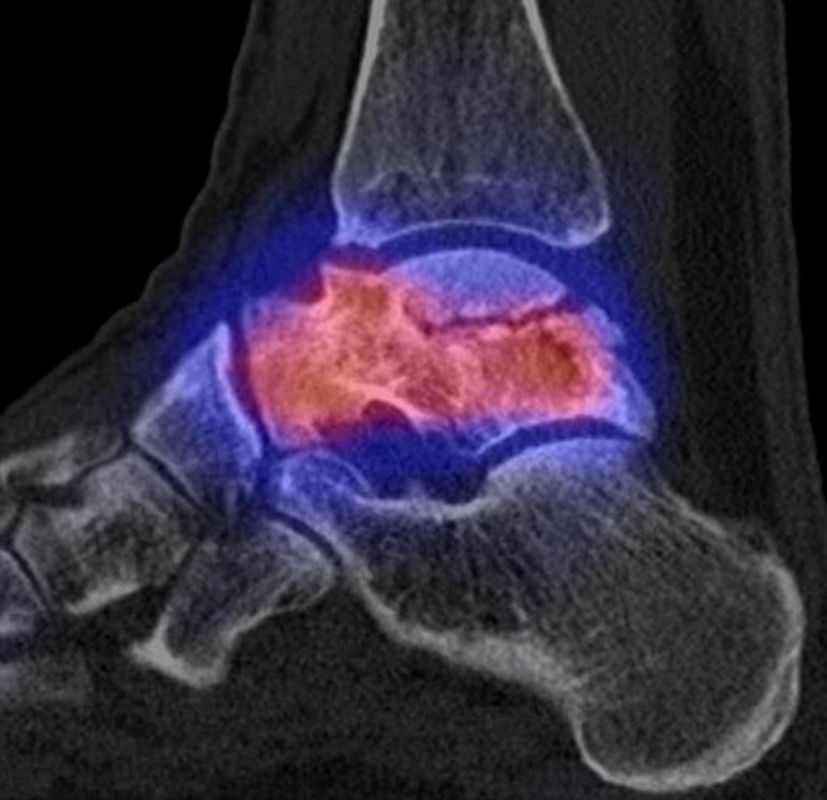 Zahlreiche Erkrankungen des Fußes bzw. der Sprunggelenke können treffsicher (> 90 %) mit Hilfe der SPECT/CT im Hinblick auf ihre klinische Relevanz diagnostiziert werden: exemplarisch insbesondere Fußwurzelarthrosen, Osteochondrale Läsionen, Sprunggelenk-Impingement, Coalitionen, Stressfrakturen, Sesambein-Pathologien, knöcherne Akzessoria, Arthrodesen-Komplikationen, Prothesen-Komplikationen, Arthritiden, Osteomyelitis, Diabetischer Fuß, Knochen-Nekrosen und Sehnen- bzw. Band-Pathologien.