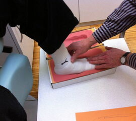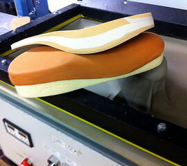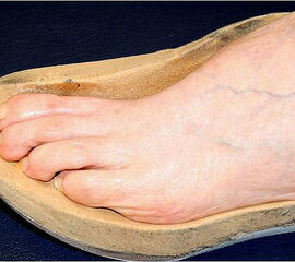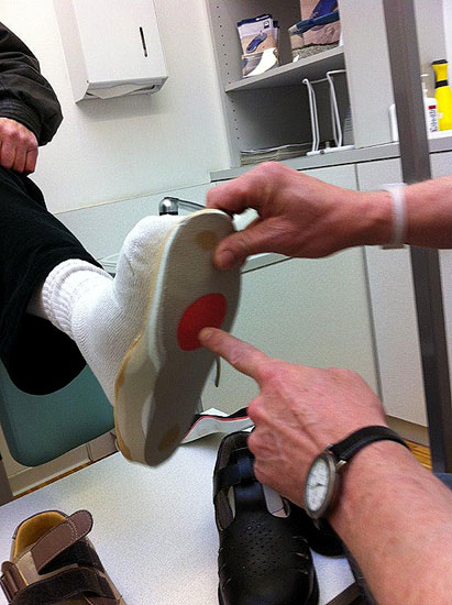 - Danach wird eine Sohle aufgeschäumt, in die ein Rollabsatz sowie eine Mittelfußrolle eingeschliffen werden. Mit dieser Maßnahme ist der Patient mobil und die gefährdeten Stellen des Fußes sind durch die Fußbettung teilentlastet. Hierdurch sind die besten Voraussetzungen für die Heilung eines Ulkus oder Malum perforans gegeben.