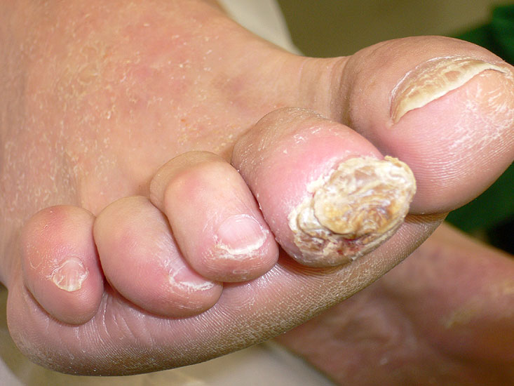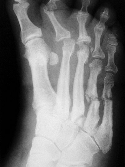 Hierbei handelt es sich um Nekrosen der Interphalangeal-, Metatatarsophalangealgelenke und Metatarsalia, was es zur knöchernen Resorption an den Mittelfußköpfchen und Zehengliedern führt. Die Stummel der Metatarsalia gleichen abgelutschten Zuckerstengeln, bohren sich in der Abstoßphase in die Sohle und führen zum Malum perforans.