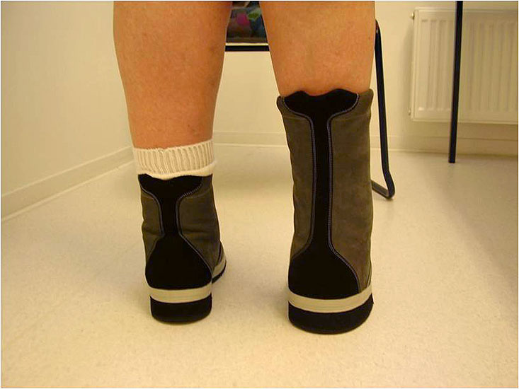 Muss der gesamte Rückfuss stabilisiert werden, ist ein mindestens 20 cm hoher Arthrodesenstiefel indiziert. Dieser umfasst eine rigide Arthrodesenkappe, welche den Rückfuss fasst, eine versteifte Polsterlasche sowie eine Mittelfußrolle und einen Pufferabsatz (Abb. 16)