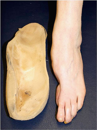 Zusätzlich zur Versorgung mit dem oben beschriebenen Konfektionsschuh, muss in diesem Fall auf die speziellen Fußdeformitäten eingegangen werden. Hierzu wird der Konfektionsschuh orthopädieschuhtechnisch zugerichtet und gegebenenfalls mit bettenden Einlagen meist aus Weichschaummaterialien versorgt (Abb. 8). Bei Achsabweichungen in der unteren Extremität (z.B. Genu varum oder valgum) kann der Lotaufbau durch eine Verbreiterung des Absatzes und/oder einen Flügelabsatz verändert werden. Weitere Möglichkeiten sind ein Puffer- oder Rollabsatz, um durch eine Verkürzung des hinteren Hebels die Kräfte, die auf den Rückfuß einwirken zu vermindern. Zur Reduktion der auf den Vorfuß wirkenden Kräfte können Abrollhilfen (Ballen- oder Mittelfußrolle) eingesetzt werden. Diese wirken über eine Verkürzung des vorderen Hebelarmes. Ein klassisches Einsatzgebiet sind Druckspitzen unter den Metatarsaleköpfchen. Bei Deformitäten am medialen oder lateralen Fußrand, bzw. am Fußrücken besteht die Möglichkeit durch Aussparungen und Polsterungen des Schuhschaftes diesen der Fußdeformität anzupassen.