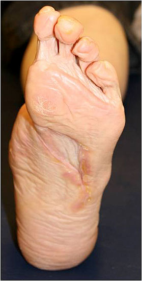 Durch den erhöhten Druck finden sich Hornhautverschwielungen an den mechanisch stark belasteten Stellen der Fußsohle und den Zehen. Die Hornhautschwielen, die immer bakteriell infiziert sind, gleichzeitig aufgrund der reduzierten Elastizität der Haut zu Rissen und damit Eintrittspforten führen, sind Ausgangspunkte diabetischer Ulzera.