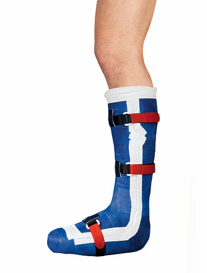 - Zunächst wird ein Unterschenkelgips (in Kunststofftechnik) mit guter Polsterung anmodelliert. Dieser Gips wird geschalt, mit gepolsterten Gurten versehen und mit Plastazote ausgepolstert.