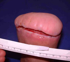 Wenn bei flächenhafter Blutung oder bei unvollständig sanierter Infektion die Wunde verschlossen wird, ist eine Wundheilungsstörung vorprogrammiert. Es ist jedoch möglich, im Infektbereich zu amputieren, wenn das verbleibende Gewebe eine gute Vitalität aufweist. Die Sanierung der Infektion erfolgt dann durch regelmäßiges Debridement und Antibiotikatherapie. Wir haben den Eindruck, dass ein Unterdruckverband die Infektheilung unterstützen kann. Dieses konnte jedoch bislang nicht wissenschaftlich untermauert werden. Die Wirksamkeit des Unterdruckverbands zur Wundkonditionierung gilt als sicher 6.