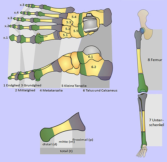 Am Fuß existieren 2 - 5 parallele Knochen. An der 3. Stelle der Kodierung wird angegeben, welche der parallelen Knochen amputiert worden sind. Der mediale Knochen erhält die Ziffer 1, die lateralen aufsteigend bis zur Ziffer 5 (Abb. 4a).