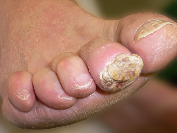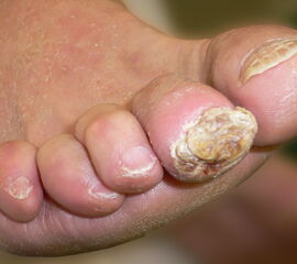 Unter normalen Bedingungen findet sich eine gleichförmige Beschwielung unter dem gesamten Vorfuß, der lateralen Hälfte des Mittelfußes und unter der gesamten Ferse. Hyperkeratosen sind an unphysiologischer Lokalisation ein zuverlässiger Indikator für eine pathologische Fehlbelastung. Neben einer Beurteilung von Hautkoloritveränderungen (DD Infektion, pAVK, Osteoarthropathie, venöse Stauung, Ekzeme usw.) sind vor allem die Zehenzwischenräume auf Zeichen einer Dermatomykose zu prüfen. Der Bereich der Zehennägel ist bedingt durch die hohe Indzidenz von Onchomykosen beim Diabetiker, ein Einwachsen im Nagelrandbereich (Unguis incarnatus) und Verletzung benachbarter Zehen durch unzureichende oder falsche Pflege der oft hypertrophen Nägel ein häufiger Ausgangspunkt von Infektionen und Ulzerationen (Abb. 4).