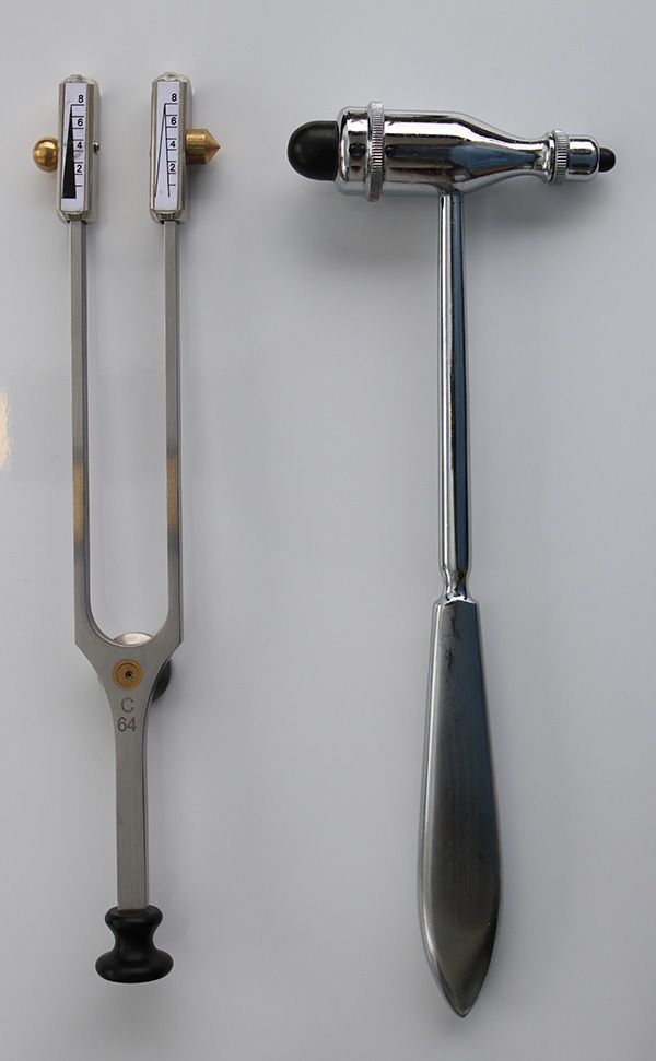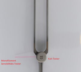 Falls angiologische und/oder neurologische Vorbefunde nicht vorliegen, sollte diesbezüglich zumindest eine Basisdiagnostik erfolgen. Die Pulse der A. tibialis posterior und A. dorsalis pedis werden getastet. Die Rekapillarisierungszeit im Bereich der Zehen wird beurteilt. Bei nicht tastbaren Fußpulsen sollte umgehend eine weitergehende angiologische Diagnostik eingeleitet werden. Dann sollten die Muskeleigenreflexe sowie das Schmerz-, Berührungs-, Temperatur- und Vibrationsempfinden im Bereich von Unterschenkel und Fuß zumindest grob geprüft werden. Einfache Hilfsmittel wie das 10g-Semmes-Weinstein-Monofilament, eine 128-Hz-Stimmgabel und ein TipTherm® sind dabei sehr nützlich.