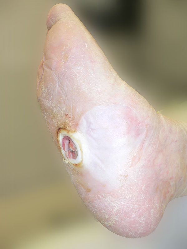 Am liegenden Patienten wird insbesondere die Fußsohle inspiziert. Neben der Beurteilung von Hautfeuchtigkeit und -temperatur ist die Oberflächenbeschaffenheit gerade beim DFS genau zu prüfen und nach evtl. vorhandenen Fehlbeschwielungen, Rhagaden, subkeratotischen Einblutungen und Hämatomen zu fahnden. Bei manifestem Ulcus erfolgt eine exakte Klassifikation (Wagner-Armstrong-Klassifikation), die Beschreibung der Lokalisation und Ausdehnung sowie eine Fotodokumentation der Läsion.