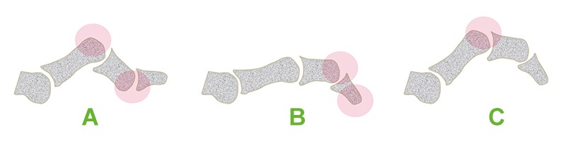 Die Flexionsfehlstellungen der Kleinzehen, welche in flexible und kontrakte Deformitäten unterschieden werden, bedürfen je nach Lokalisation der Beugefehlstellung einer klaren Begriffstrennung (Hepp 2004). Bei der Hammerzehe kommt es zu einer maximalen Beugung im Zehenmittelgelenk und einer Überstreckung im Grundgelenk (Abb. 3a), bei der Malletzehe dagegen zu einer alleinigen, maximalen Beugung im Endglied (Abb. 3b) Die Krallenzehe entsteht oft aus einer Hammerzehe. Es findet sich eine Dorsalextension im Grundgelenk und eine Beugefehlstellung sowohl im Mittel- als auch im Endgelenk, wobei die die Zehenspitze den Boden in der Regel nicht mehr berührt (Abb. 3c). Die in den Abbildungen verdickt gekennzeichneten Hautareale sind bei den einzelnen Deformitäten vermehrt druckbelastet und damit beim DFS ulcusgefährdet. Da die Begriffsbestimmungen häufig in der Literatur unklar sind und mehrdeutig verwendet werden empfiehlt sich oft die Beschreibung der genauen Deformität, z.B. Hyperextension im Metatarsophalangeal-Gelenk (MTP), kontrakte Flexionsfehlstellung im proximalen Interphalangealgelenk (PIP) oder distalen Interphalangealgelenk (DIP).