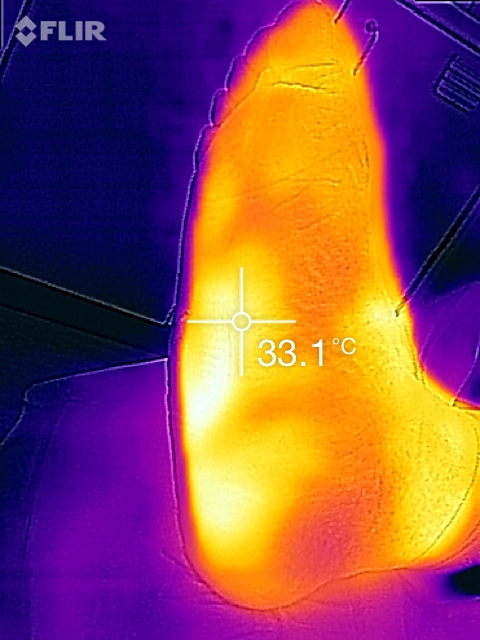Ziel der Palpation des Fußes ist das Erfassen pathologisch veränderter Strukturen und deren Zuordnung zu einem anatomischen Korrelat sowie die Suche nach evtl. Schmerzpunkten. Aufgrund der Neuropathie die Aussagekraft des Parameters „Schmerz“ beim DFS begrenzt. Häufig besteht eine Druckschmerzhaftigkeit erst bei einer bis in tiefere Fußkompartimente reichenden Infektion. Die bei der Inspektion gefundenen kritischen Punkte mit lokal vermehrter Beschwielung werden abgetastet, um knöcherne Prominenzen nicht zu übersehen. Im Bereich entzündlicher Veränderungen der Haut dient die Palpation dem Auffinden eines möglichen subkutanen Flüssigkeitsverhaltes oder Gelenkergusses und von lokalen Temperaturdifferenzen. Da die Fähigkeit der manuellen Temperaturprüfung stark eingeschränkt, subjektiv und nicht reproduzierbar ist, hat sich eine Hautoberflächentemperaturmessung mittels Infrarotthermometer bewährt 12. Gerade beim Monitoring der akuten Osteoarthropathie ist damit durch seitenvergleichende Messung eine gute Korrelation zum Aktivitätsgrad der Entzündung herzustellen 1314 (EK III, HG A). Das beim DFS in der Regel atrophierte plantare Fettpolster, die oft verhärtete Plantarfaszie und die kritische Region der Mittelfußköpfchen sollten sorgfältig abgetastet werden.
