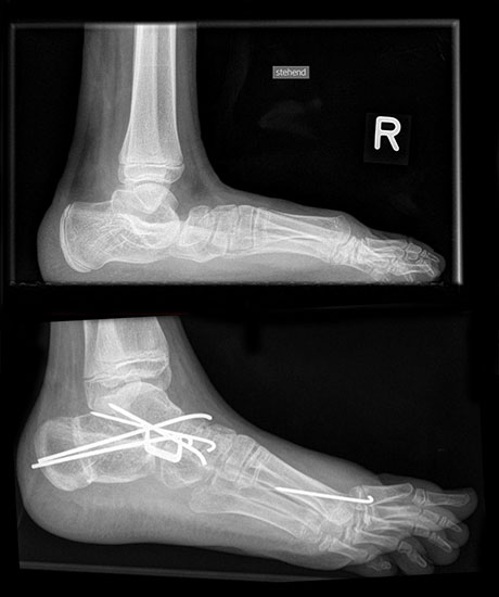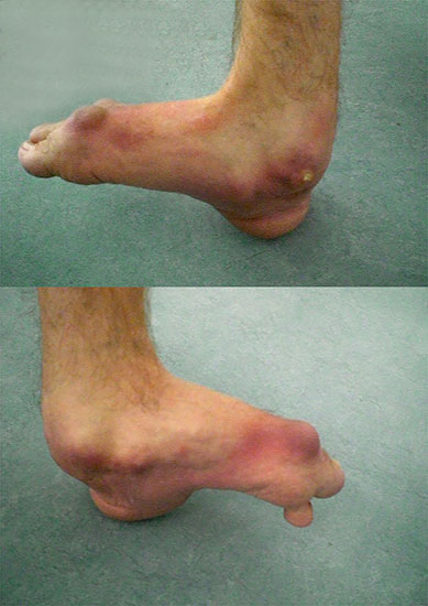 Bei Patienten mit schweren Hackenfußdeformitäten in Kombination mit stark eingeschränkter Steh- und Gehfähigkeit ist dagegen nicht die Belastbarkeit, sondern die Versorgbarkeit mit Schuhen und Orthesen das Hauptbehandlungsziel. Zur Erleichterung der Fußpflege und des Anziehens von schützendem und wärmendem Schuhwerk sind hier meist weichteilige Release-Operationen ohne Muskeltransfer und ohne Arthrodesen ausreichend.