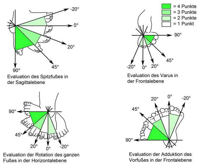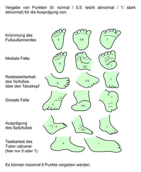Bereits bei der klinischen Untersuchung sind die verschiedenen Schweregrade zu dokumentieren. Es finden sich flexible Klumpfußhaltungen bis hin zu nicht korrigierbaren Klumpfüßen 5.