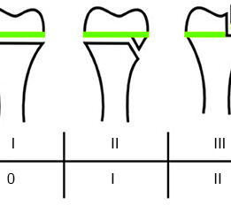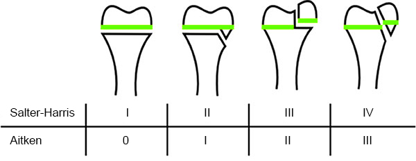 Bei relevanten Axialtraumata kreuzt der Frakturspalt den epiphysären Anteil der Wachstumsfuge (Fugengelenkfraktur, Aitken II und III), mit entsprechenden Risiko das Wachstum zu beeinflussen. Die verschiedenen Klassifikationssysteme der Frakturen im Wachstumsalter sind in Abbildung 2 45 dargestellt.