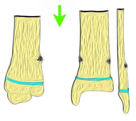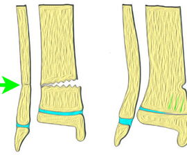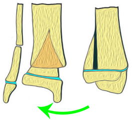 - Triplane-I-Fraktur: Epiphysäre Fraktur, mit teilweisem Verlauf durch die Wachstumsfuge und gleichzeitigem metaphysären Keil.