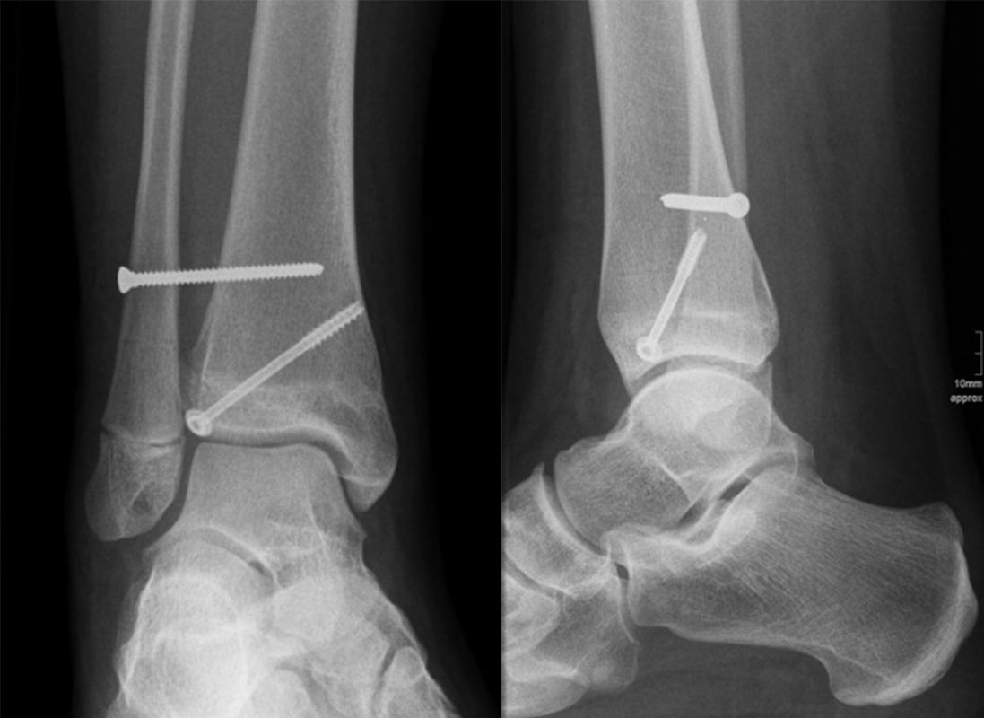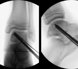 Dislozierte Frakturen (Frakturspalt > 2 mm) werden grundsätzlich operativ behandelt. Die Reposition kann arthroskopisch unterstützt erfolgen. Die Schraubenosteosynthese erfolgt entsprechend dem Frakturverlauf. Bei Twoplain Frakturen ist meist eine epiphysäre Schraube ausreichend die von lateral kommend das Fragment nach medial-proximal fixiert. Der Schraubenverlauf ist üblicherweise von lateral ventral nach proximal dorsal medial (Abb. 24). Nach Reposition darf in der seitlichen Aufnahme des Sprunggelenks, als auch in der 45° Außenrotationsaufnahme keine Stufe in Höhe der Wachstumsfuge erkennbar sein. Eine sichtbare Stufe ist Indikator für eine unzureichende Reposition.