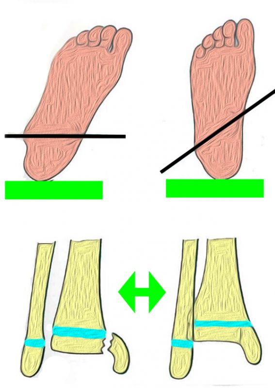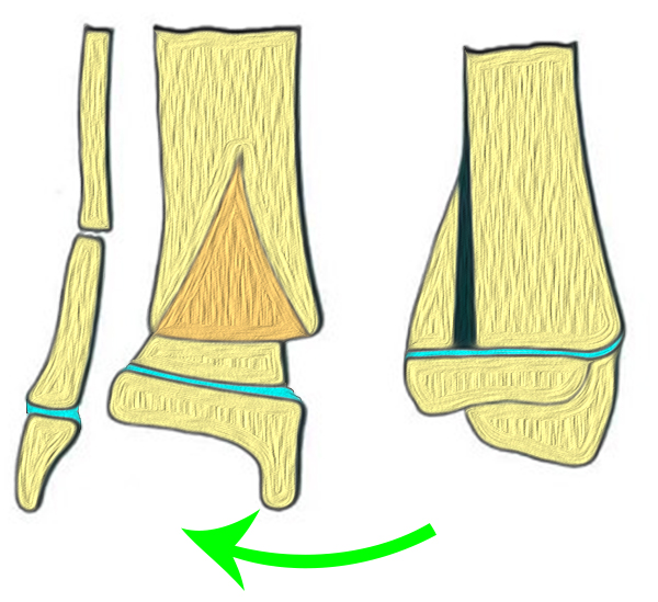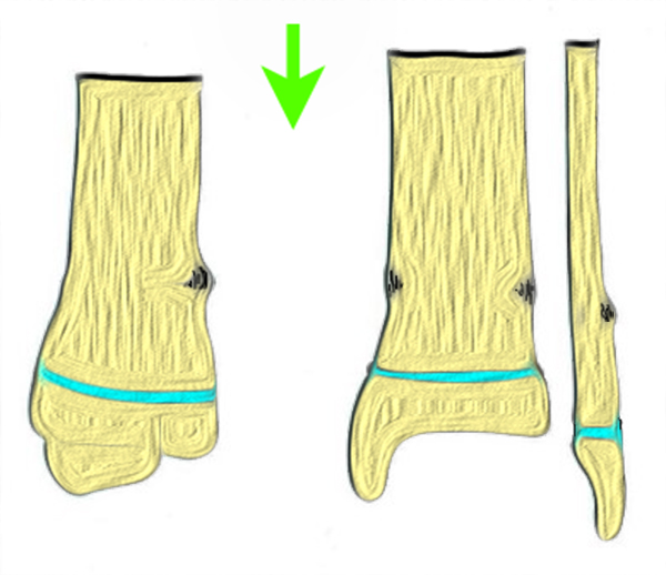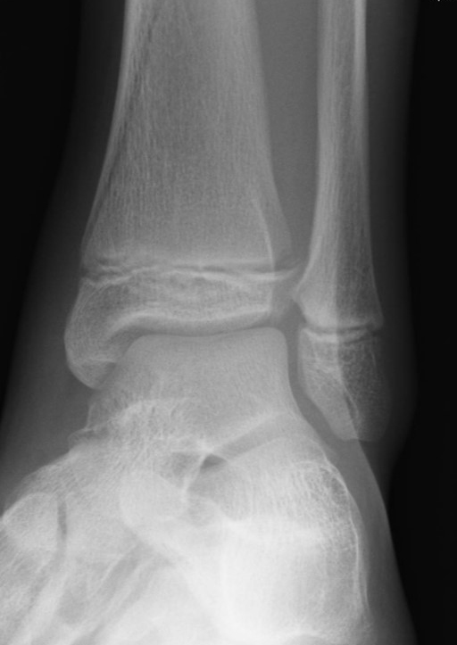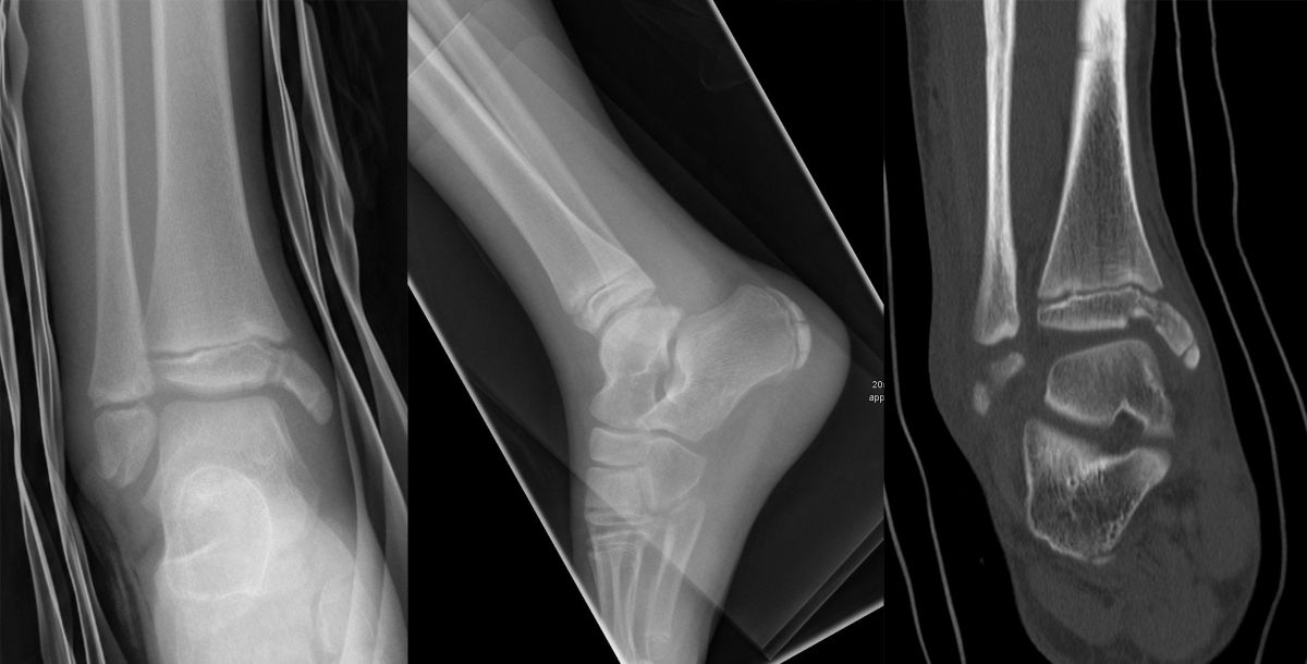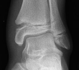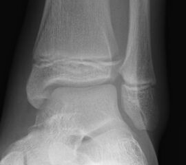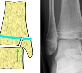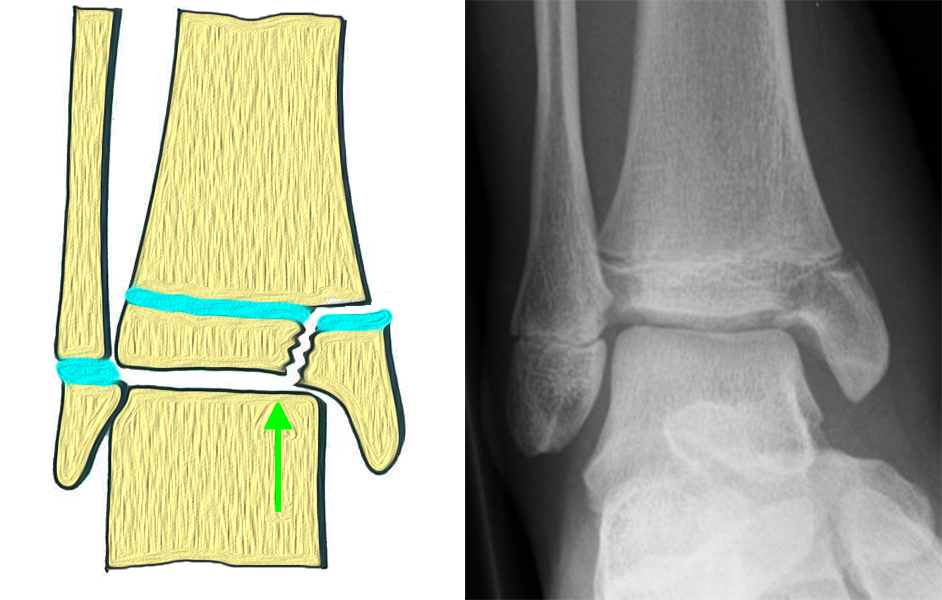 In Abhängigkeit vom Reifezustand der Wachstumsfuge kann der epiphysäre Frakturspalt sehr weit medial bis ganz lateral zu liegen kommen. Ein sehr weit lateral liegender Frakturspalt entspricht funktionell nahezu einem knöchernen Ausriss der vorderen Syndesmose, was sich im Röntgenbild an einer erweiterten Malleolengabel erkennen lässt 9.