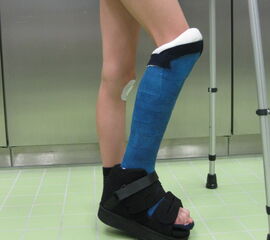 Nach einer primären Ruhigstellung im gespaltenen Unterschenkelgipses kann dieser nach Abschwellung geschlossen werden. Nach 10 Tagen erfolgt der Wechsel auf einen geschlossenen Unterschenkel-Kunststoffgips für weitere 3-4 Wochen. Da sehr kleine Kinder aus Unterschenkelgipsen gerne herausschlüpfen, sollte in diesen Fällen an die Möglichkeit der anfänglichen Oberschenkelgipsanlage gedacht werden. Die immer wieder genannte Sarmiento-Gipsanalge hat für uns bei der Behandlung von Sprunggelenksverletzungen im Kindesalter keinen Stellenwert. Den Indikationsbereich des Sarmiento-Gipses mit Freigabe der Mobilität im Kniegelenk in einem Bewegungsausmaß von 0-30-120° und Lastreduzierung für den Unterschenkel durch eine Abstützung an den Femurkondylen, sehen wir vor allem bei der diaphysären Unterschenkelfraktur.